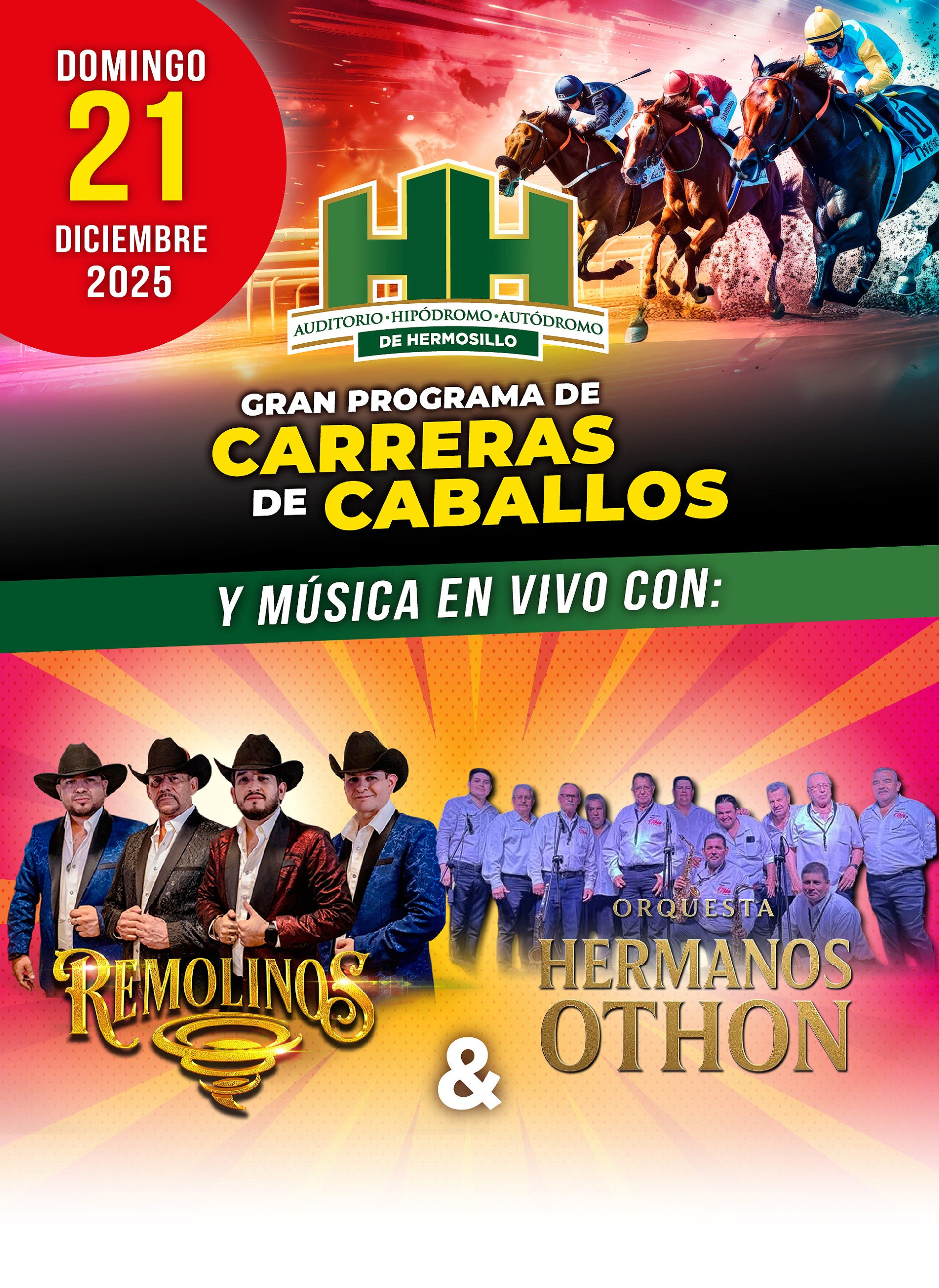 Eventos >CARRERAS DE CABALLOS REMOLINOS ORQUESTA DE LOS HERMANOS OTHON 21 / 12 / 2025 12:00:00>Lugar: Hipodromo, Hermosillo, Sonora, México
